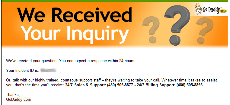 24 hours seems like far too long of a wait. I don't have that much patience. While most companies are trying to reduce costs and push users toward the web and email, GoDaddy makes it easier to call... which is fine. That's not a bad alternative and they clearly set expectations upfront. Where I take issue is with companies that provide an e-mail address on their website and then don't respond for two or three days. Sometimes even longer.