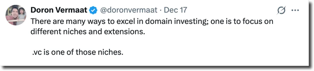 I recently saw a post on X by Doron Vermaat about investing in .vc domains. It caught my attention mostly because it wasn't something I had ever seriously considered. After a couple of rodeos, I have developed a pretty good sense of what fits my style and what does not. I'd always written off .vc as too niche, too expensive, too far outside my wheelhouse to bother learning about. .vc had always fallen squarely into the "not for me" category, largely without much thought.