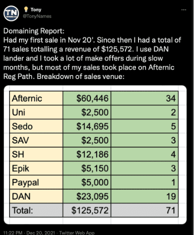 TonyNames: 100% of my sales happen via inbound inquiries via DAN, Afternic, Sedo and a few via squadhelp.