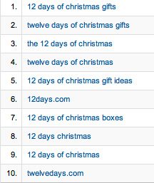 Jonathon: Our top targeted keywords are "Twelve Days of Christmas" and its variants (12 Days, etc.), as well as "Christmas", "Gifts", and "Boxes". Thankfully, those are the keywords that Google thinks we're most relevant on (except for "heirloom", which we're not optimizing for, but that's fine.) As you can see from the attached Google Analytics screencap, we're seeing our highest volume of search traffic on these terms.