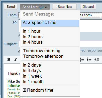 Let's say your a owner of a widget company. You get to work on Thursday morning at 7:00am and check your email. There, you find a message from Mike Sullivan asking if you're interested in acquiring WidgetMaker.com. You glance up at the time the email was sent and it says 1:14am. That's not necessarily a bad thing, but to some, I may lose credibility for not looking like I am a legitimate business. Much of the mail I receive in the wee hours tends to be spam, so I understand the concern. The thought has plagued me until I decided to see what my options are available.