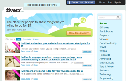 I find myself drifting off and writing about some brandable names, and that's okay. One of my Twitter connections mentioned Fiverr.com in a tweet and I had been meaning to check it out. The plus side to this domain, it was easy to remember. It had been weeks since I saw the tweet and I still remembered the name. Unfortunately, I forgot who tweeted it, so forgive me for not giving you credit.
